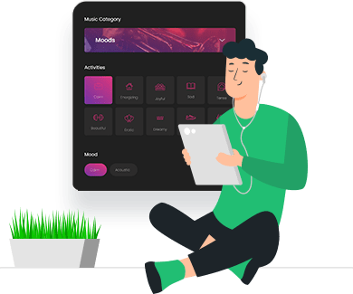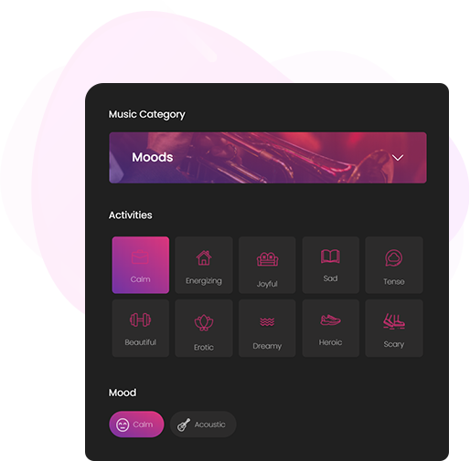 Select your genre from our huge library, find the perfect activity to match your video's energy and tone and then find a mood to really dial it in. Then, set the length of your audio track.